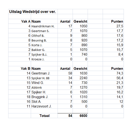 H. Haandrikman winnaar Vak A. met 17 vissen en 1050 gr. in vak B. J. Geertman winnaar met 58 vissen en 1630 gr. in de Hoogeveensevaart. (Rogat boven de sluis, Hek tot aan de brandweer)